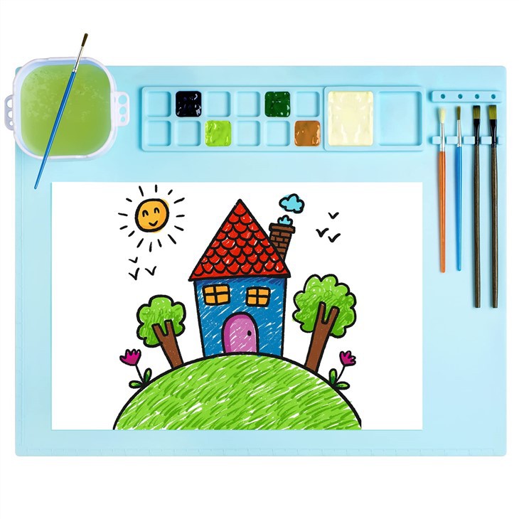 3. Denne oppdaterte silikonmatten har to store runde malingsbrett for effektiv blanding, en sammenleggbar børsterensekopp og muligheten til å brukes som malingpalett og palle. Denne silikonmatten har skalaer på venstre og bunn som er mer praktisk for din kunstneriske produksjon.
